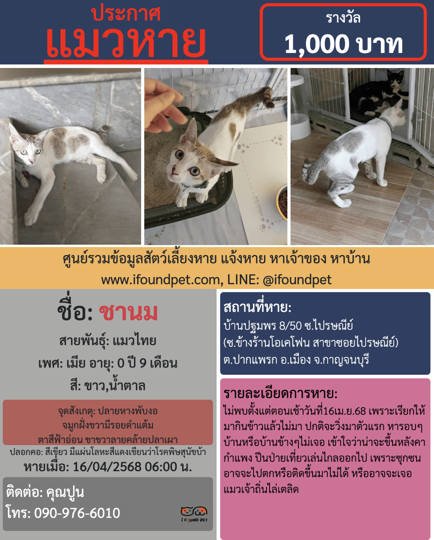 ไม่พบตั้งแต่ตอนเช้าวันที่16เม.ย.68 เพราะเรียกให้มากินข้าวแล้วไม่มา ปกติจะวิ่งมาตัวแรก หารอบๆบ้านหรือบ้านข้างๆไม่เจอ เข้าใจว่าน่าจะขึ้นหลังคา กำแพง ปีนป่ายเที่ยวเล่นไกลออกไป เพราะซุกซน อาจจะไปตกหรือติดขึ้นมาไม่ได้ หรืออาจจะเจอแมวเจ้าถิ่นไล่เตลิด