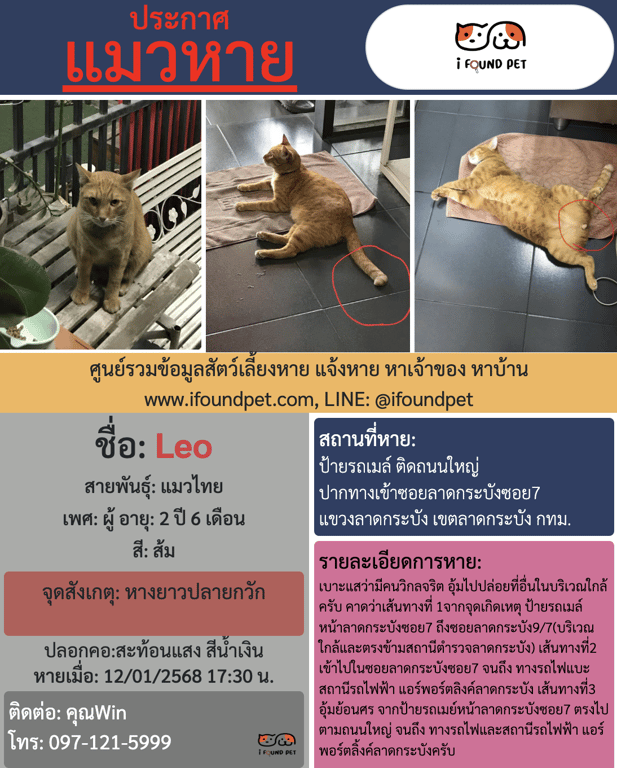 เบาะแสว่ามีคนวิกลจริต อุ้มไปปล่อยที่อื่นในบริเวณใกล้ครับ คาดว่าเส้นทางที่ 1จากจุดเกิดเหตุ ป้ายรถเมล์ หน้าลาดกระบังซอย7 ถึงซอยลาดกระบัง9/7(บริเวณใกล้และตรงข้ามสถานีตำรวจลาดกระบัง) เส้นทางที่2 เข้าไปในซอยลาดกระบังซอย7 จนถึง ทางรถไฟแบะสถานีรถไฟฟ้า แอร์พอร์ตลิงค์ลาดกระบัง เส้นทางที่3 อุ้มย้อนศร จากป้ายรถเมย์หน้าลาดกระบังซอย7 ตรงไปตามถนนใหญ่ จนถึง ทางรถไฟและสถานีรถไฟฟ้า แอร์พอร์ตลิ้งค์ลาดกระบังครับ
