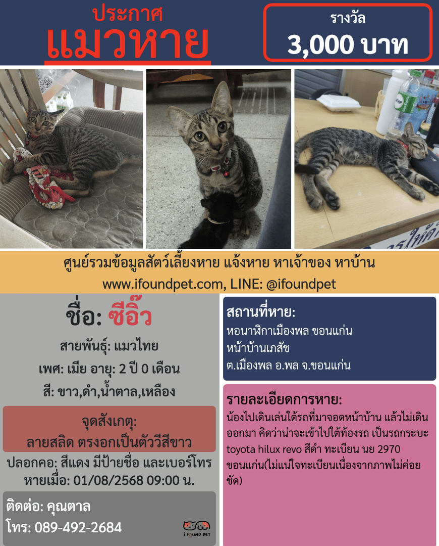 น้องไปเดินเล่นใต้รถที่มาจอดหน้าบ้าน แล้วไม่เดินออกมา คิดว่าน่าจะเข้าไปใต้ท้องรถ เป็นรถกระบะ toyota hilux revo สีดำ ทะเบียน นย 2970 ขอนแก่น(ไม่แน่ใจทะเบียนเนื่องจากภาพไม่ค่อยชัด)