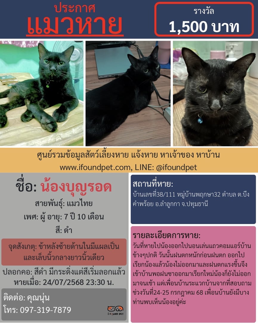 วันที่หายไปน้องออกไปนอนเล่นแถวคอมแอร์บ้านข้างๆปกติ วันนั้นฝนตกหนักก่อนฝนตก ออกไปเรียกน้องแล้วน้องไม่ออกมาและฝนตกแรงขึ้นจึงเข้าบ้านพอฝนซาออกมาเรียกใหม่น้องก็ยังไม่ออกมาจนเช้า แต่เพื่อนบ้านระแวกบ้านจากที่สอบถามช่วงวันที่24-25 กรกฎาคม 68 เพื่อนบ้านยังมีบางท่านพบเห็นน้องอยู่ค่ะ