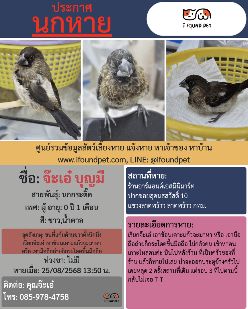 เรียกจ๊ะเอ๋ เอาช้อนเคาะแก้วจะมาหา หรือ เอามือถือถ่ายก็กระโดดขึ้นมือถือ ไม่กลัวคน เข้าหาคน เกาะไหล่คนค่ะ บินไปหลังร้าน ที่เป็นครัวของที่ร้าน แล้วก็หายไปเลย น่าจะออกประตูข้างครัวไป เคยหลุด 2 ครั้งสถานที่เดิม แต่รอบ 3 ที่ไปตามนี้กลับไม่เจอ T-T