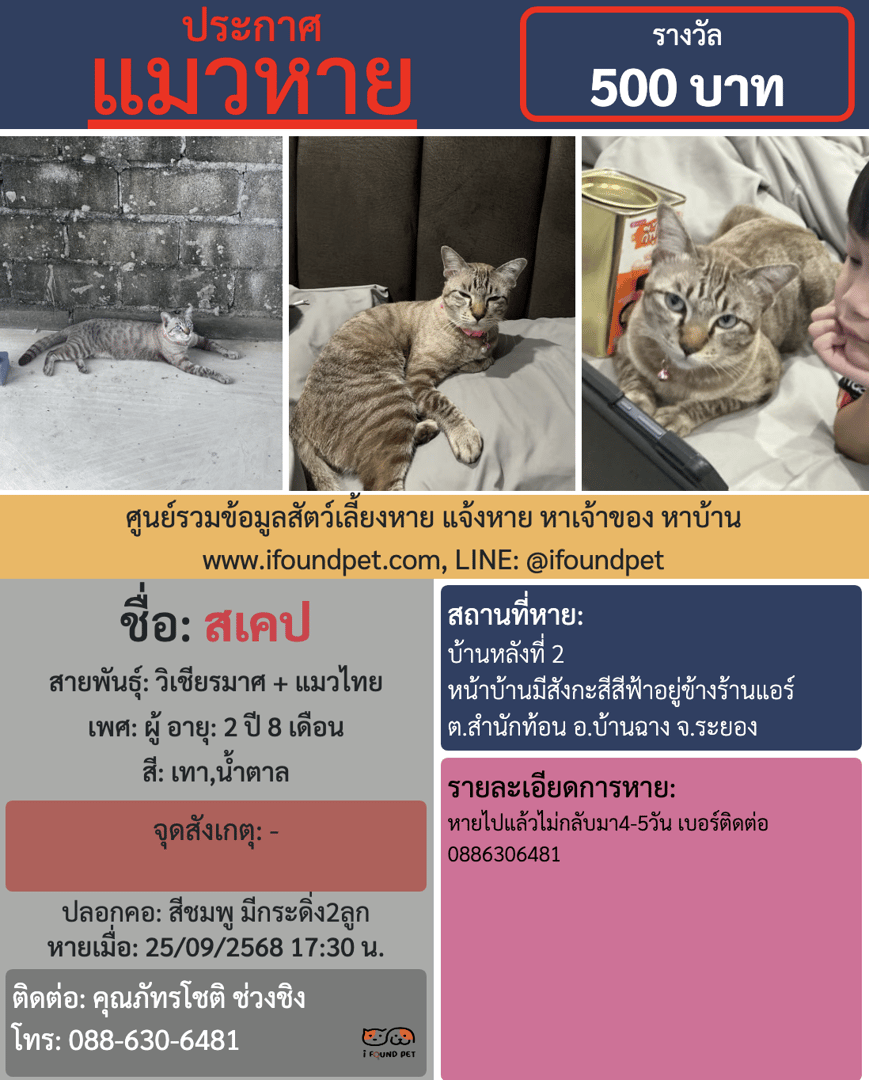 มีปลอกคอสีชมพูอุ้มได้นางใจดีแต่เข้าไปด้วยดีนะ ไม่กัด มันชอบเดินพันขาหายไปเมื่อวันที่25/ก.ย./2568ไม่รู้ว่ามีบาดแผลมั้ย