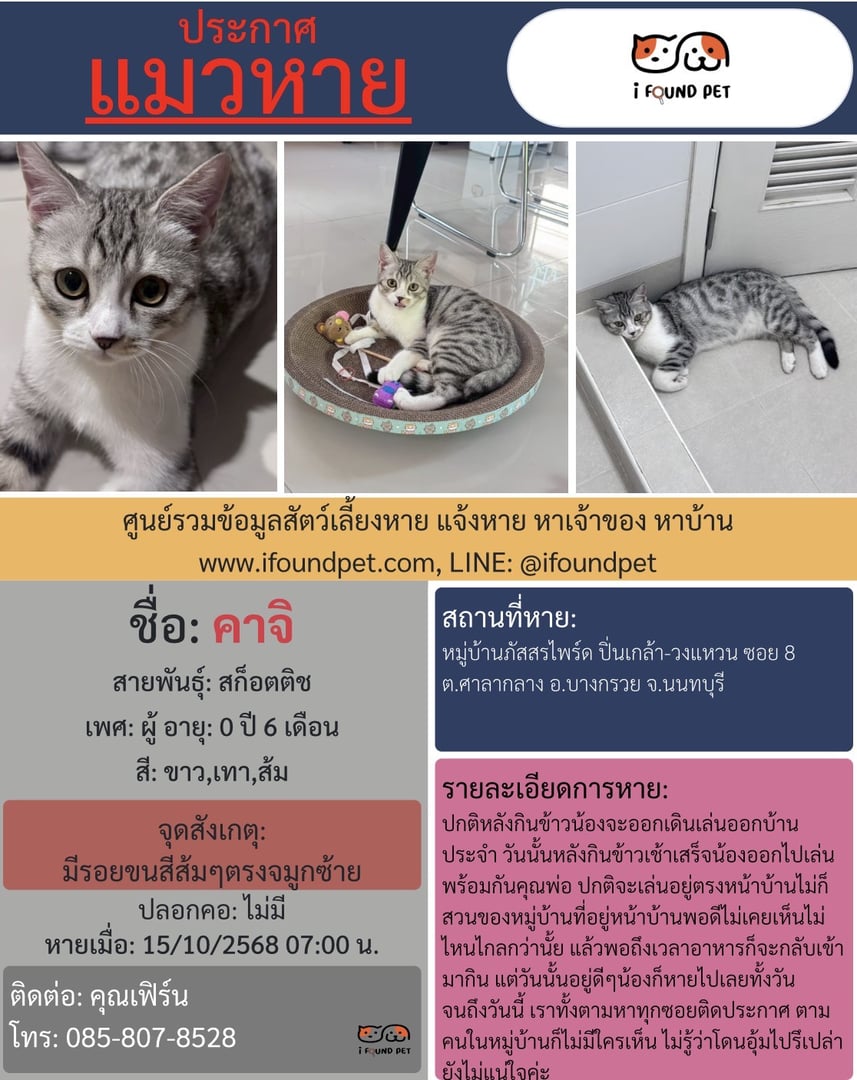 ปกติหลังกินข้าวน้องจะออกเดินเล่นออกบ้านประจำ วันนั้นหลังกินข้าวเช้าเสร็จน้องออกไปเล่นพร้อมกันคุณพ่อ ปกติจะเล่นอยู่ตรงหน้าบ้านไม่ก็สวนของหมู่บ้านที่อยู่หน้าบ้านพอดีไม่เคยเห็นไม่ไหนไกลกว่านั้ย แล้วพอถึงเวลาอาหารก็จะกลับเข้ามากิน แต่วันนั้นอยู่ดีๆน้องก็หายไปเลยทั้งวัน จนถึงวันนี้ เราทั้งตามหาทุกซอยติดประกาศ ตามคนในหมู่บ้านก็ไม่มีใครเห็น ไม่รู้ว่าโดนอุ้มไปรึเปล่ายังไม่แน่ใจค่ะ