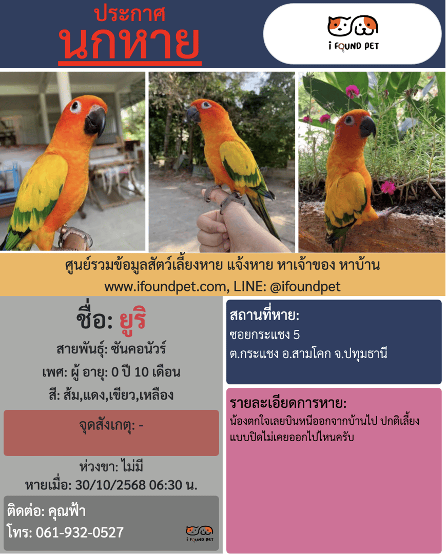 น้องตกใจเลยบินหนีออกจากบ้านไป ปกติเลี้ยงแบบปิดไม่เคยออกไปไหนครับ
