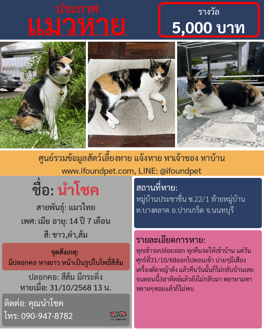 ทุกเช้าจะปล่อยออก ทุกคืนจะให้เข้าบ้าน แต่วันศุกร์ที่31/10/68ออกไปตอนเช้า บ่ายๆมีเสียงเครื่องตัดหญ้าดัง แล้วคืนวันนั้นก็ไม่กลับบ้านเลย จนตอนนี้3อาทิตย์แล้วยังไม่กลับมา พยายามหาหลายๆซอยแล้วก็ไม่พบ