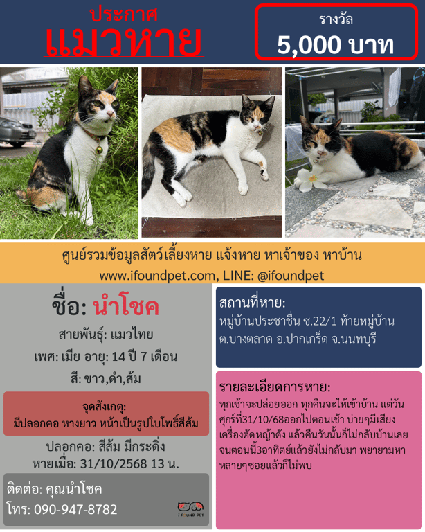 ***ใครมีเบาะแสน้องรบกวนแจ้งทีนะคะ กำลังจะครบ5เดือนแล้ว ยังมีความหวังอยู่ ยังอยากเจอน้อง*** ทุกเช้าจะปล่อยออก ทุกคืนจะให้เข้าบ้าน แต่วันศุกร์ที่31/10/68ออกไปตอนเช้า บ่ายๆมีเสียงเครื่องตัดหญ้าดัง แล้วคืนวันนั้นก็ไม่กลับบ้านเลย จนตอนนี้3อาทิตย์แล้วยังไม่กลับมา พยายามหาหลายๆซอยแล้วก็ไม่พบ
