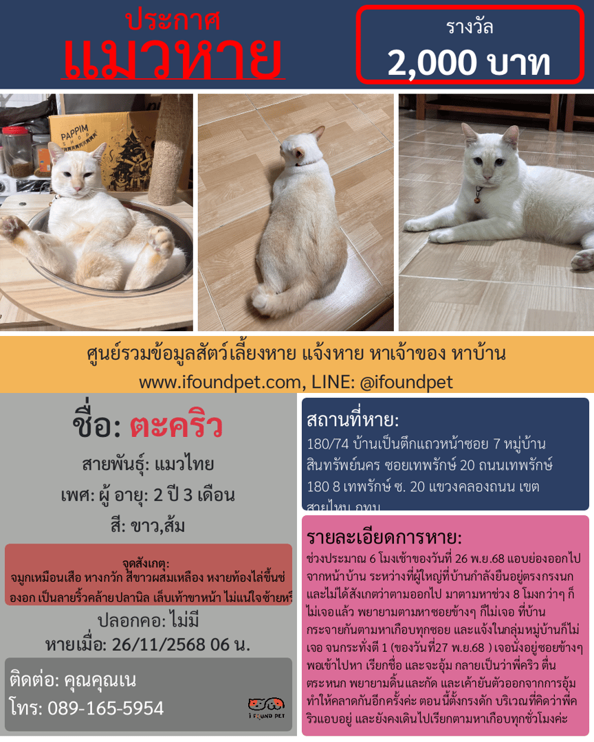พิกัด : หมู่บ้านสินทรัพย์นคร ( ตึกแถวหน้าซอย 7 ) ซ.เทพรักษ์20 ถนนเทพรักษ์ คลองถนน สายไหม กรุงเทพฯ วันที่หาย : วันที่ 26 พ.ย.68 เวลา 6 โมงเช้า (ย้อนดูกล้อง)ช่วงประมาณ 6 โมงเช้าของวันที่ 26 พ.ย.68 แอบย่องออกไปจากหน้าบ้าน ระหว่างที่ผู้ใหญ่ที่บ้านกำลังยืนอยู่ตรงกรงนก และไม่ได้สังเกตว่าตามออกไป มาตามหาช่วง 8 โมงกว่าๆ ก็ไม่เจอแล้ว พยายามตามหาซอยข้างๆ ก็ไม่เจอ เจอแต่แมวจร ที่บ้านกระจายกันตามหาเกือบทุกซอย และแจ้งในกลุ่มหมู่บ้านก็ไม่เจอ จนกระทั่งตี 1 (ของวันที่27 พ.ย.68 ) เจอนั่งอยู่ซอยข้างๆ พอเข้าไปหา เรียกชื่อ และจะอุ้ม กลายเป็นว่าพี่คริว ตื่นตระหนก พยายามดิ้นและกัด และเค้ายันตัวออกจากการอุ้ม ทำให้คลาดกันอีกครั้งค่ะ ตอนนี้ตั้งกรงดัก บริเวณที่คิดว่าพี่คริวแอบอยู่ และยังคงเดินไปเรียกตามหาเกือบทุกชั่วโมงค่ะ - นิสัยปกติไม่ดุร้าย เจอคนไม่คุ้นเคยหรือแปลกหน้า จะชอบแอบและหลบ ตอนนี้พี่ๆและน้องๆของพี่ตะคริว ร้องหาตลอด หากใครอยู่ย่านสะพานใหม่ เทพรักษ์ สายไหม วัชรพล (เผื่อเตลิดไปไกล) เจอแมวที่ลักษณะคล้ายพี่คริว รบกวนแจ้งมาด้วยนะคะ คุณเน 089-1655954