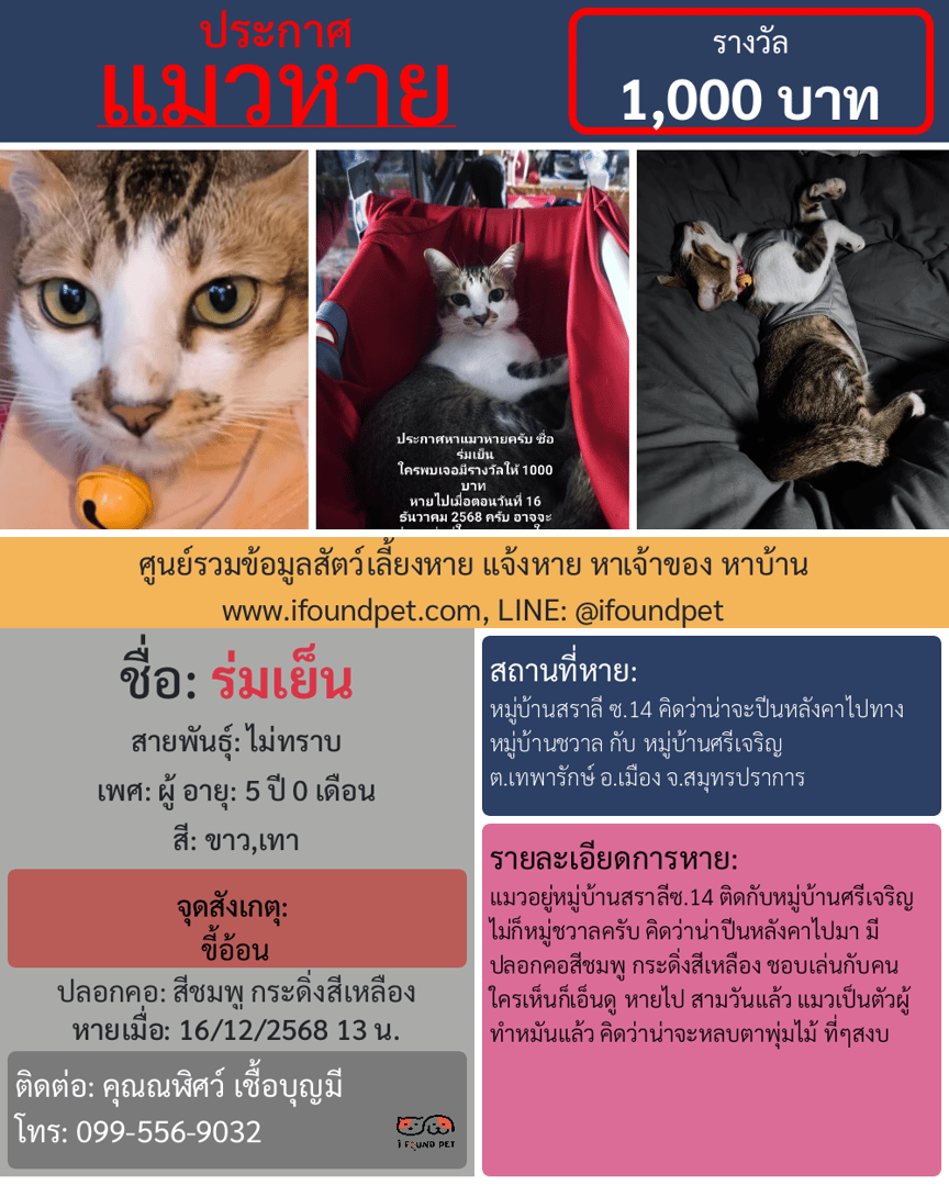 อยู่หมู่บ้านสราลี ซ.14 เทพารักษ์64 ชอบเล่นกับคน นิสัยดี ก่อนหายไปใส่กระดิกสีเหลือง ปลอกคอชมพู ดูแข็งแรง ดูแล้วน่าเอ็นดู คิดว่าน่าแอบในพุ่มไม้ หรือในชุมชน แถวๆ ซอยชวาล ซอยศรีเจริญ หรือ ไปไกลกว่า รบกวนคนพบเจอช่วยติดต่อ 0995569032 นะครับ มีร◌างวัลให้ 1000 บาท