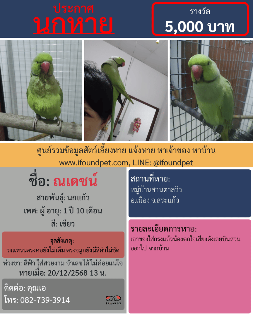เอาของใส่กรงแล้วน้องตกใจเสียงดังเลยบินสวนออกไป จากบ้าน