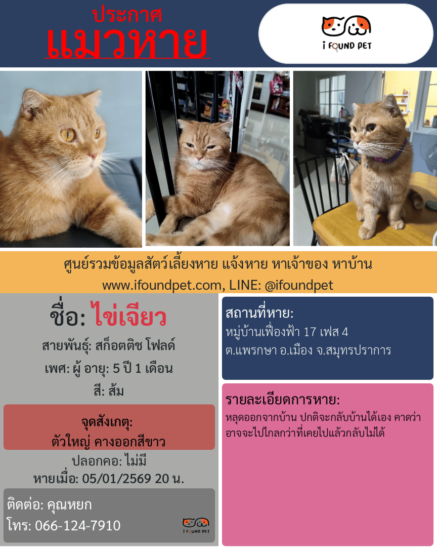 หลุดออกจากบ้าน ปกติจะกลับบ้านได้เอง คาดว่าอาจจะไปไกลกว่าที่เคยไปแล้วกลับไม่ได้