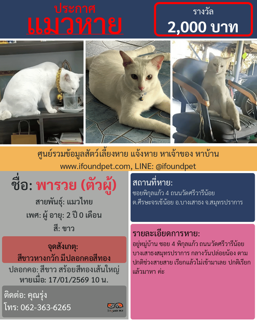 อยู่หมู่บ้าน ซอย 4 พิกุลแก้ว ถนนวัดศรีวารีน้อย บางเสาธงสมุทรปราการ กลางวันปล่อยน้อง ตามปกติช่วงสายสาย เรียกแล้วไม่เข้ามาเลย ปกติเรียกแล้วมาหา ค่ะ