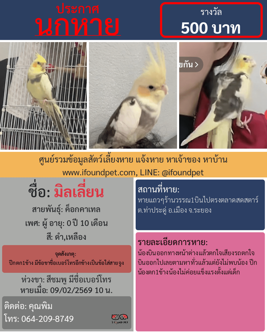 น้องบินออกทางหน้าต่างแล้วตกใจเสียงรถตกใจบินออกไปเลยตามหาทั่วแล้วแต่ยังไม่พบน้อง ปีกน้องตก1ข้างน้องไม่ค่อยแข็งแรงตั้งแต่เด็ก