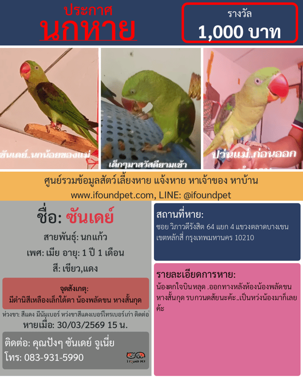 | ห่วงขา | สีแดง มีนัมเบอร์ หว่งขาสีแดงเบอร์โทรเบอร์เก่า ติดต่อไม่ได้ มีชื่อ เยาว์ มีหว่งขาแลสฝั่งช้ายคุ่สีแดง.หางน้อวจะสั้นหน่อย เพราะน◌้องพลัดขน |
