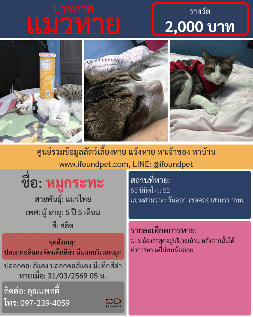 ติดต่อเจ้าของประกาศแจ้งหายง่าย รวดเร็ว ถึงไม่หายก็ลงได้ กรณีมีสัตว์เลี้ยงหายใกล้ท่าน ระบบจะมีแจ้งเตือนไปยังท่าน เพื่อให้ช่วยกันสอดส่องตามหา