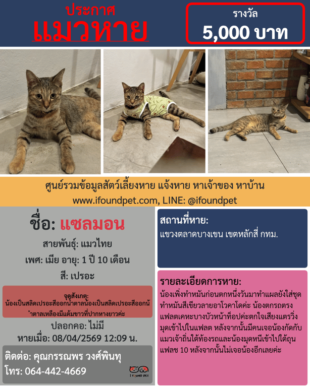 น้องเพิ่งทำหมันก่อนตกหนึ่งวันมาทำแผลยังใส่ชุดทำหมันสีเขียวลายอาโวคาโดค่ะ น้องตกรถตรง แฟลตเคหะบางบัวหน้าท็อปค่ะตกใจเสียงแตรวิ่งมุดเข้าไปในแฟลต หลังจากนั้นมีคนเจอน้องกัดกับแมวเจ้าถิ่นใต้ท้องรถและน้องมุดหนีเข้าไปใต้ถุนแฟลช 10 หลังจากนั้นไม่เจอน้องอีกเลยค่ะ
