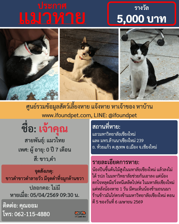 น้องปีนขึ้นต้นไม้สูงในมหาลัยเชียงใหม่ แล้วลงไม่ได้ รปภ ในมหาวิทยาลัยช่วยกันเอาลง แต่น้องตกใจหลุดมือวิ่งหนีเตลิดไปค่ะ ในมหาลัยเชียงใหม่ แต่หลังน้องหาย 1 วัน มีคนเห็นน้องข้ามถนนมาร้านข้าวมันไก่ตรงข้ามมหาวิทยาลัยเชียงใหม่ ตอนตี 5 ของวันที่ 6 เมษายน 2569