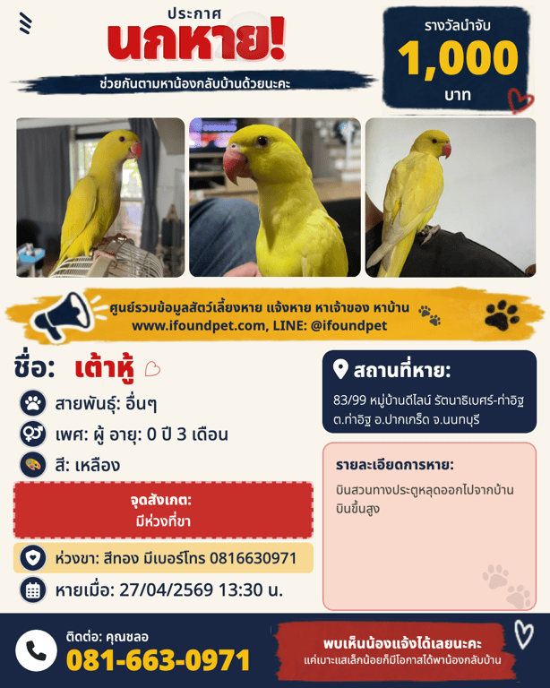 เข้าคนง่าย แต่อาจจับยาก มีห่วงพร้อมเบอร์โทรที่ขา