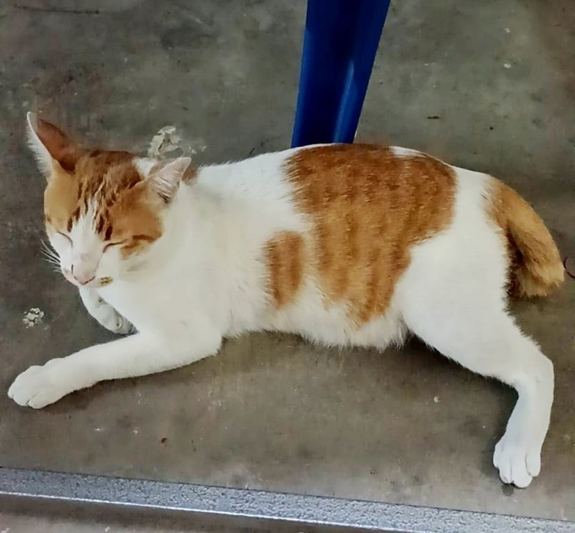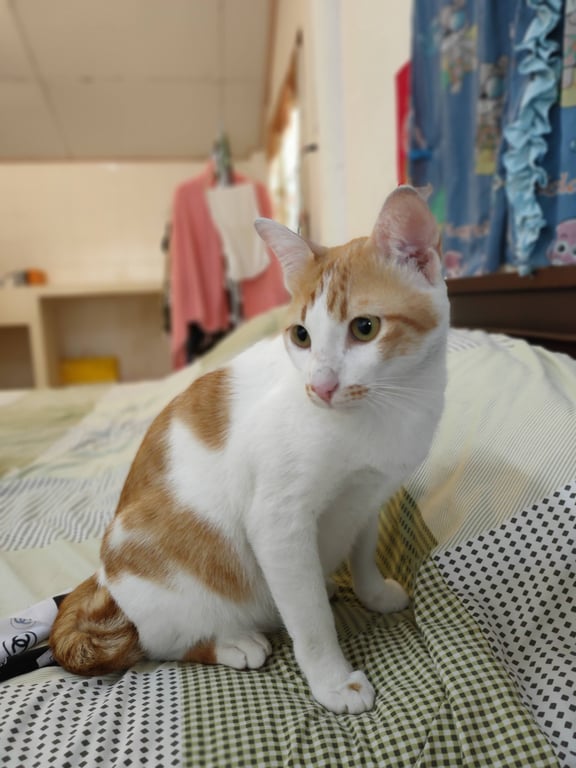 หางกวักขอด มีวงสีส้มอ่อนข้างปากซ้าย-ขวา มีแต้มสีส้มเข้มข้างจมูกด้านขวา ทำหมันแล้ว น้ำหนักประมาณ5กิโล
