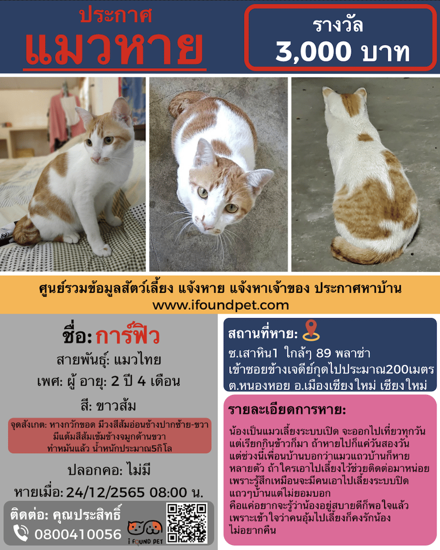 น้องเป็นแมวเลี้ยงระบบเปิด จะออกไปเที่ยวทุกวัน แต่เรียกกินข้าวก็มา ถ้าหายไปก็แค่วันสองวัน แต่ช่วงนี้เพื่อนบ้านบอกว่าแมวแถวบ้านก็หายหลายตัว ถ้าใครเอาไปเลี้ยงไว้ช่วยติดต่อมาหน่อยเถอะค่ะ เพราะรู้สึกเหมือนจะมีคนเอาไปเลี้ยงระบบปิดแถวๆบ้านแต่ไม่ยอมบอก คือแค่อยากจะรู้ว่าน้องอยู่สบายดีก็พอใจแล้ว เพราะเข้าใจว่าคนอุ้มไปเลี้ยงก็คงรักน้องไม่อยากคืน