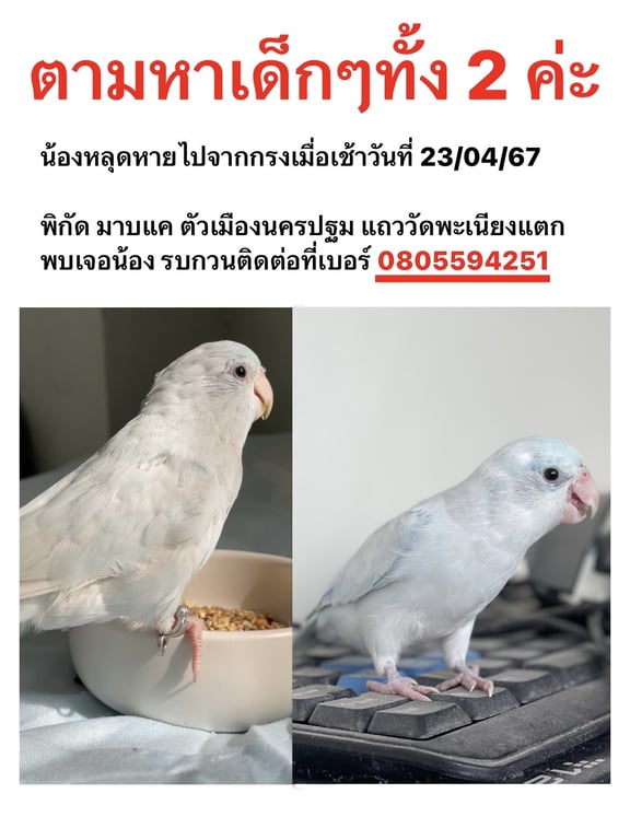 ตามหาเด็กๆทั้ง 2 ค่ะ น้องหลุดหายไปจากกรงเมื่อเช้าวันที่ 23/04/67 ลักษณะ 🪽 🤍มูมู่ : มีห่วงขาที่ข้อเท้าข้างขวา เพศเมีย 🩵บลูบรูซ : ไม่มีห่วงขา ตรงหางตามีขนสีฟ้าอ่อนๆ บนหัวมีพายสีขาว เพศชาย 🤍น้องเป็นสีอเมริกันไวท์ทั้งคู่ค่ะ🩵 หากใครที่อยู่บริเวณใกล้เคียง มาบแค ตัวเมืองนครปฐม แถววัดพะเนียงแตก พบเจอน้อง รบกวนติดต่อที่เบอร์ 0805594251 ขอบคุณมากๆนะคะ