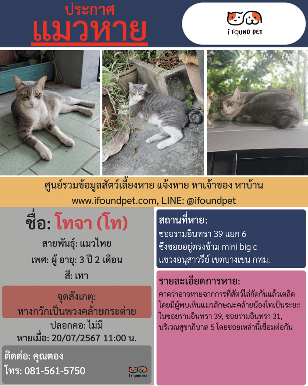 ไม่ดุ เรียบร้อย รักสันโดษ ไม่เข้าใกล้คน(ระวังตัวเอง) หายเมื่อประมาณ 20 ก.ค.67 พิกัดที่หายซอยรามอินทรา 39 แยก 6 (ซอยตลาดรามอินทรา กม.4) เขตบางเขน กรุงเทพฯ