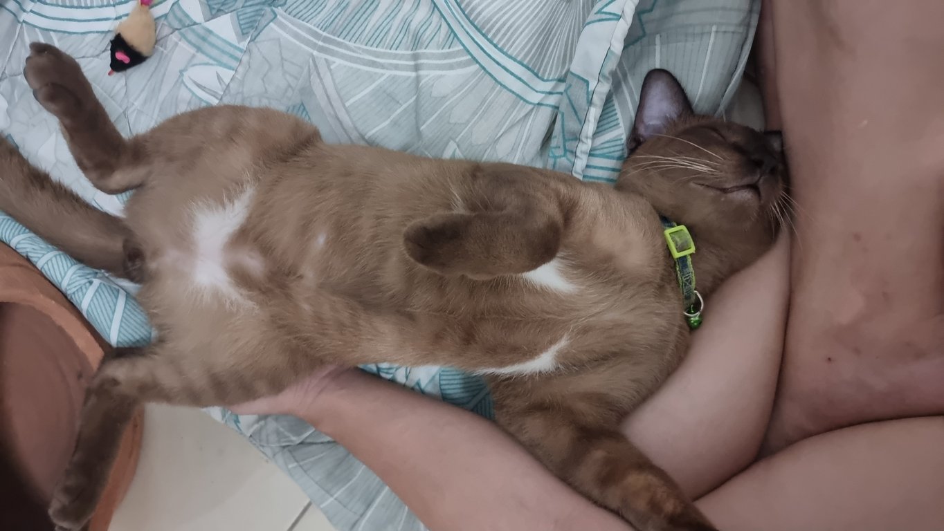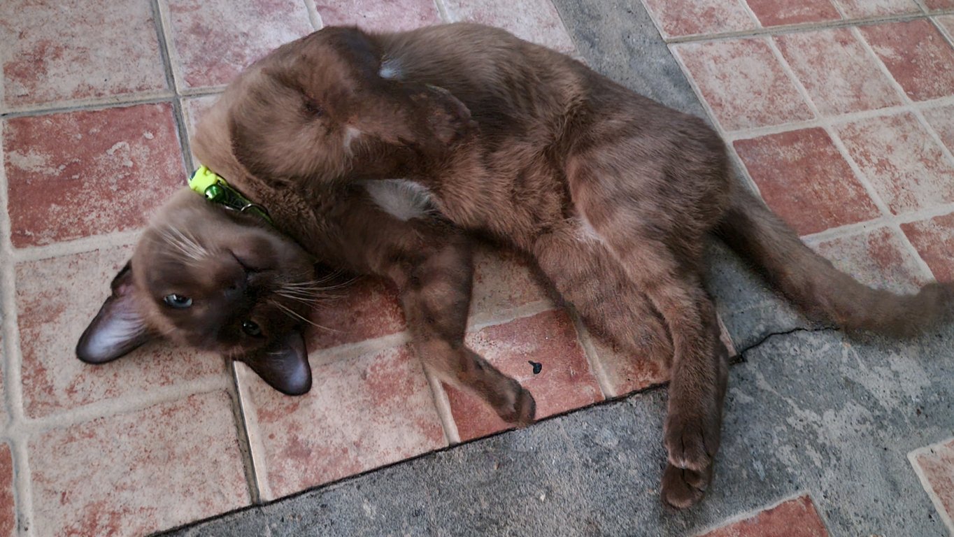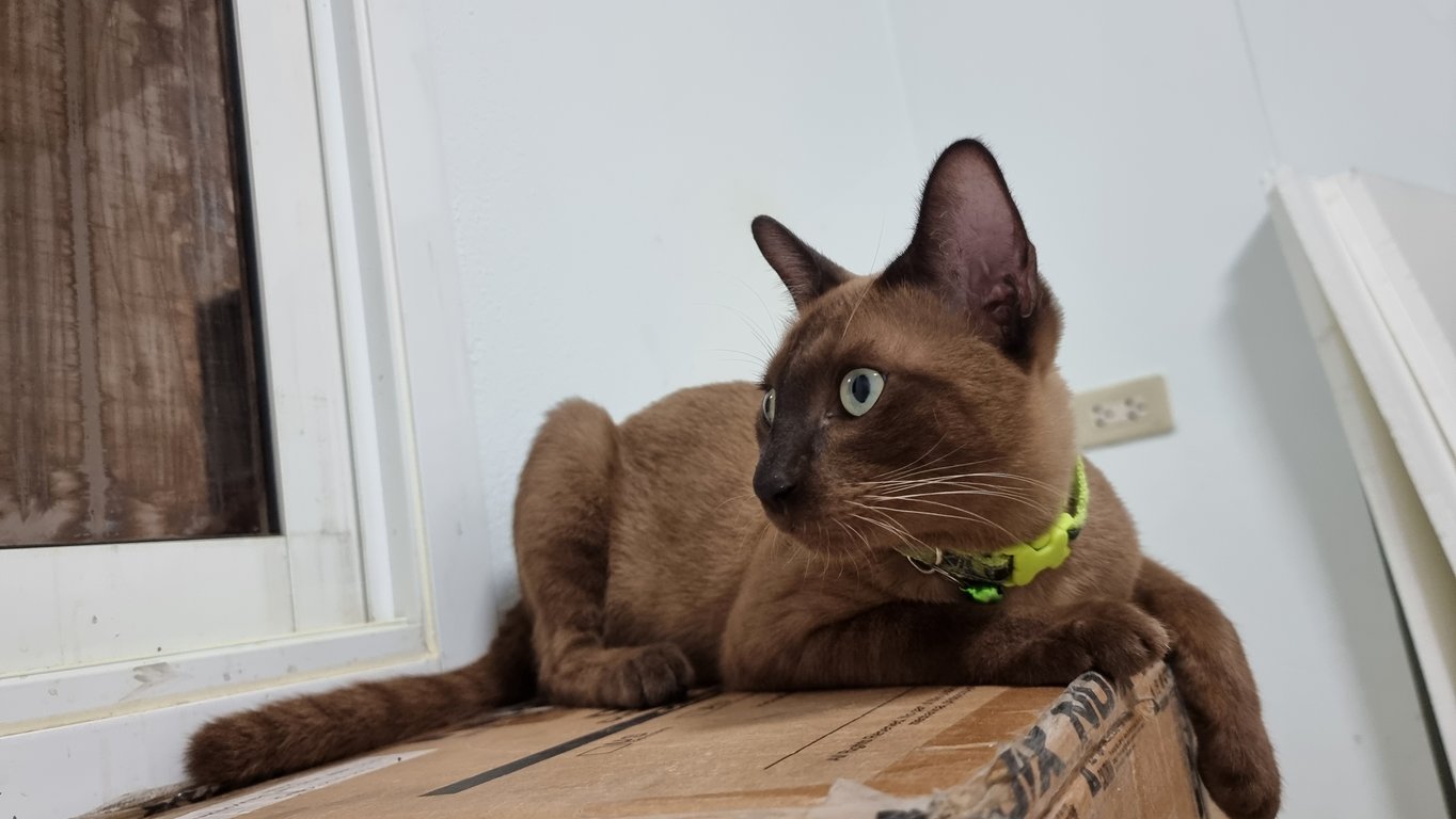 สีน้ำตาล ยังไม่ทำหมันไข่โต หางยาว มีแสมสีขาวหน้าอกและท้อง