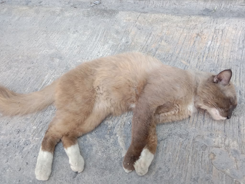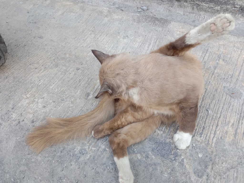 น้องลักษณะคล้ายแมวเปอร์เซียผสมแมววิเชียรมาศ ขนยาวหางนุ่มฟูสีน้ำตาล ตาสีฟ้า มีถุงเท้าสีขาวสามข้าง ยังไม่ทำหมัน เชื่องกับคนมาก ขี้อ้อน คนในพื้นที่แจ้งว่าน้องหลงมาอยู่แถวนี้ได้เกือบครึ่งปีแล้ว (น้องเอาแต่อ้อน นอนแผ่พุง เลยถ่ายมาได้แต่ภาพแบบนี้)