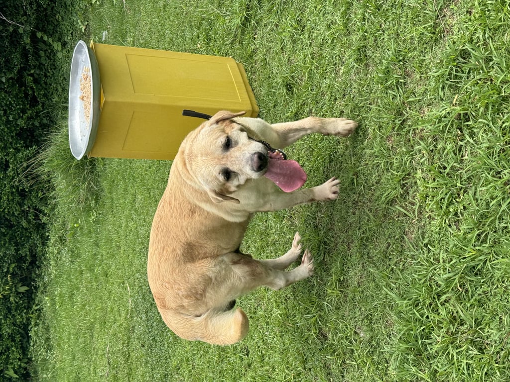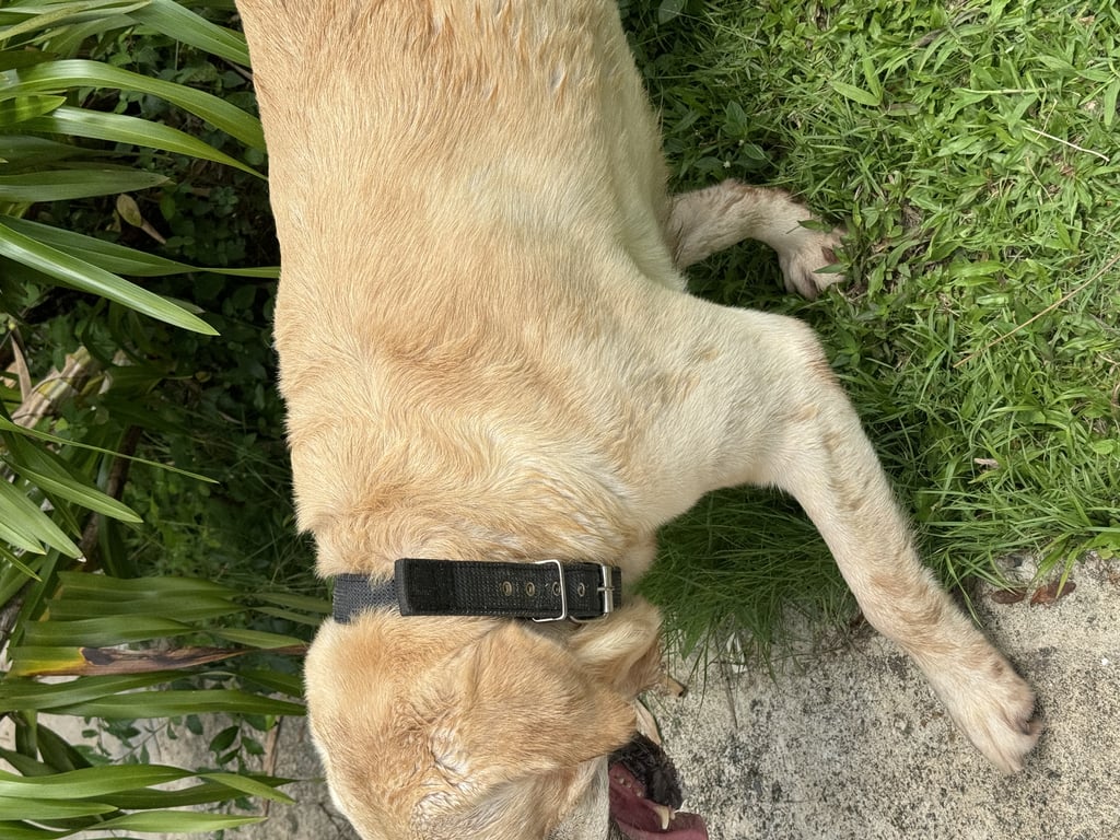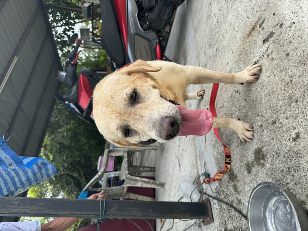 ลาบาดอร์สีครีมเพศผู้ ตัวอ้วน อายุประมาณ 7ปีขึ้นไป ปลอกคอสีดำ