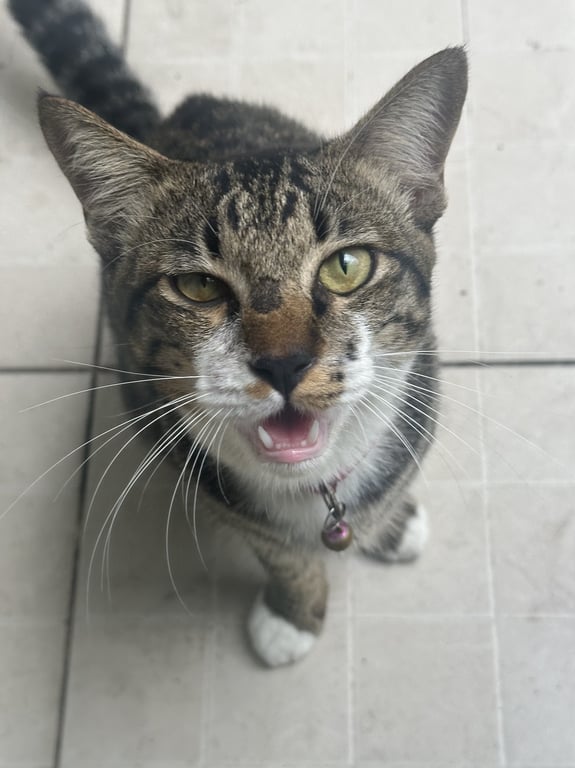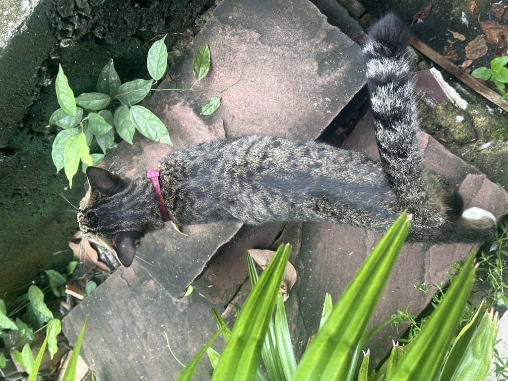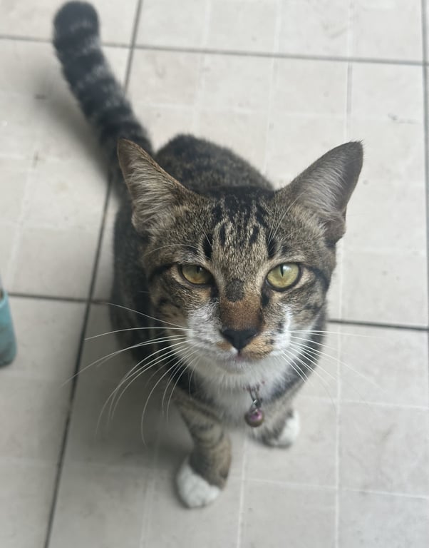 เพศผู้ อายุไม่ถึงปี ปลอกคอสีชมพู สีสลิดค่ะ คางขาว มีถุงเท้าขาว