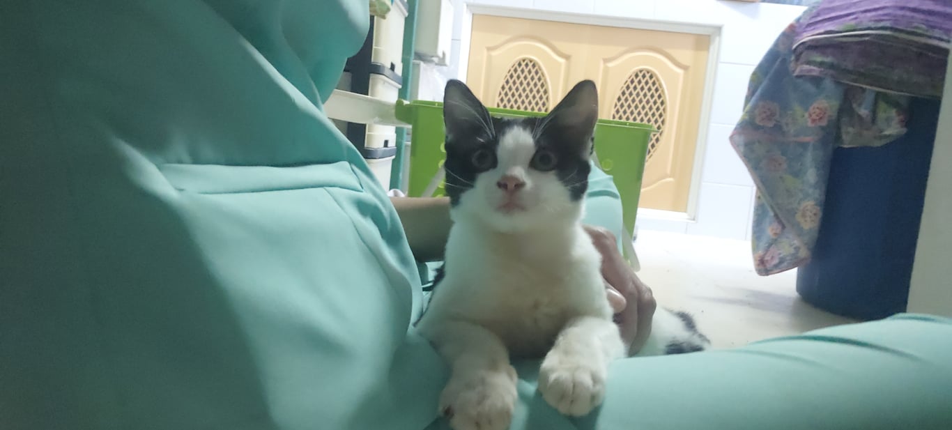 อายุประมาณ 4 เดือน เพศผู้ สีขาวดำ คุ้นคนขี้อ้อน หนวดเหมือนถูกตัด