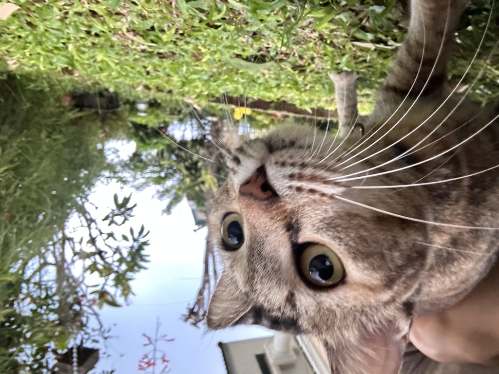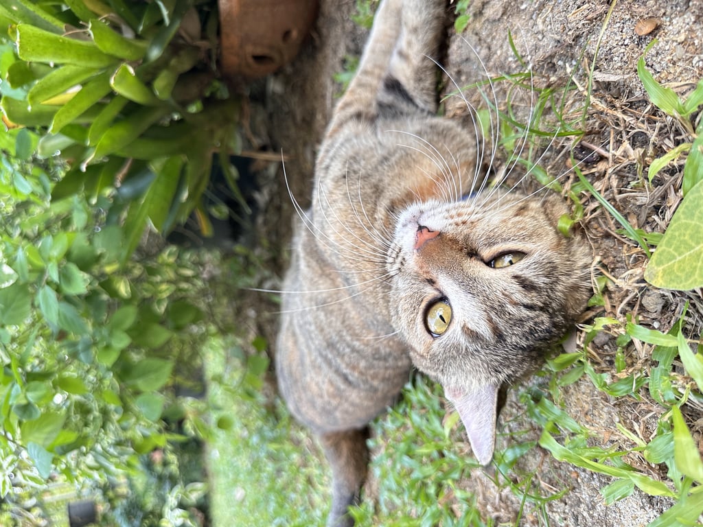 แมวสลิดสีน้ำตาล หางสีเทา ปลอกคอน้ำเงิน เป็นมิตรและไม่กลัวคน เชื่องมาก น่าจะเป็นแมวบ้านที่มีคนเลี้ยงดูมา ชอบมานั่งเล่นในสวน