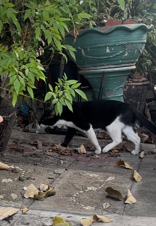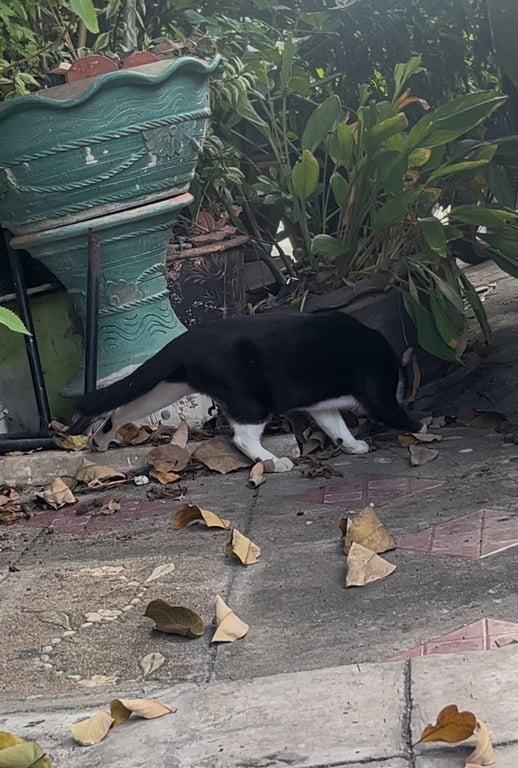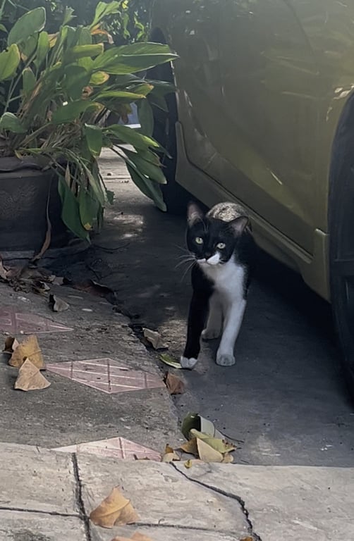 แมวสีดำขาว ไม่ทราบเพศ หน้าดำ บริเวณปากเป็นสีขาว ขาหน้าข้างขวาสีดำมีถุงเท้าขาว ขาซ้ายขาว