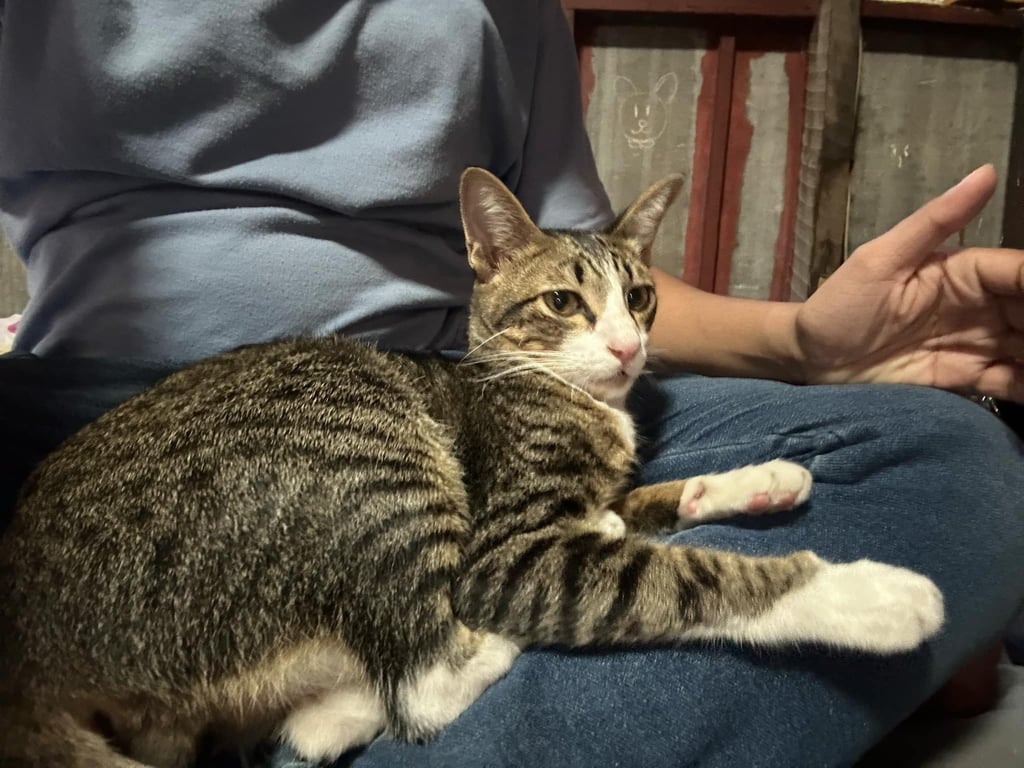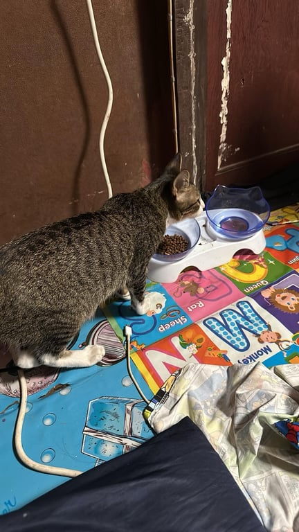 น้องลายสลิดสีเทาคอขาวถุงเท้าขาวหางยาวมาก ขี้อ้อน ติดคน เข้ากะบะทรายเป็น ยังไม่ทำหมัน