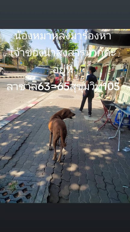 คาดว่าเป็นสุนัขพันธุ์ไทย สีน้ำตาลส้ม มีแต้มขาวบางจุดและมีสีขาวบริเวณเท้า หางปลายทู่