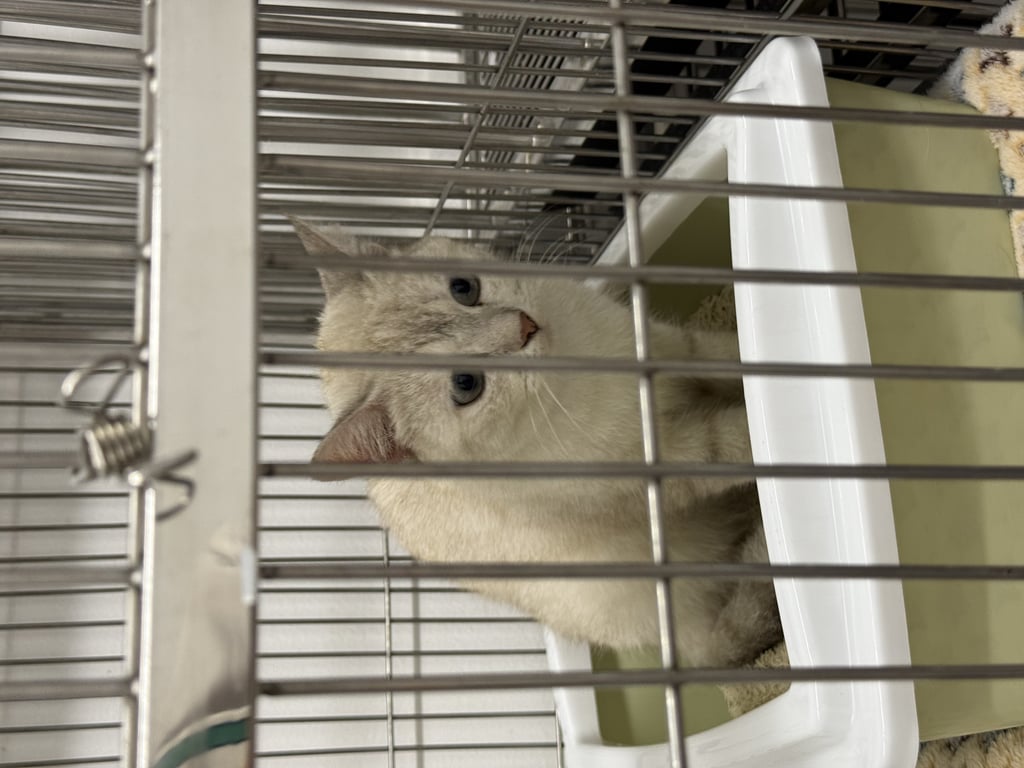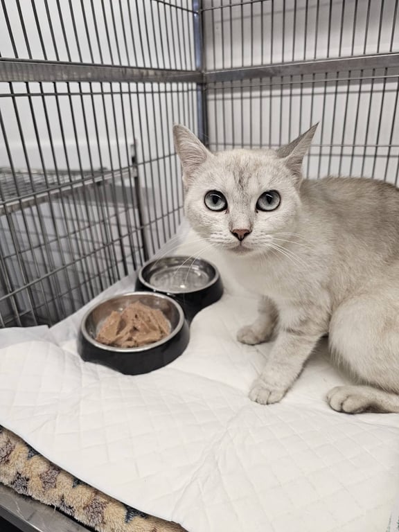 ตาสีฟ้า สีขาว ปนเทา หางยาว น้ำหนักประมาณ 2 โล เชื่องติดคนมาก เรียบร้อยไม่กลัวคน ไม่มีการขู่