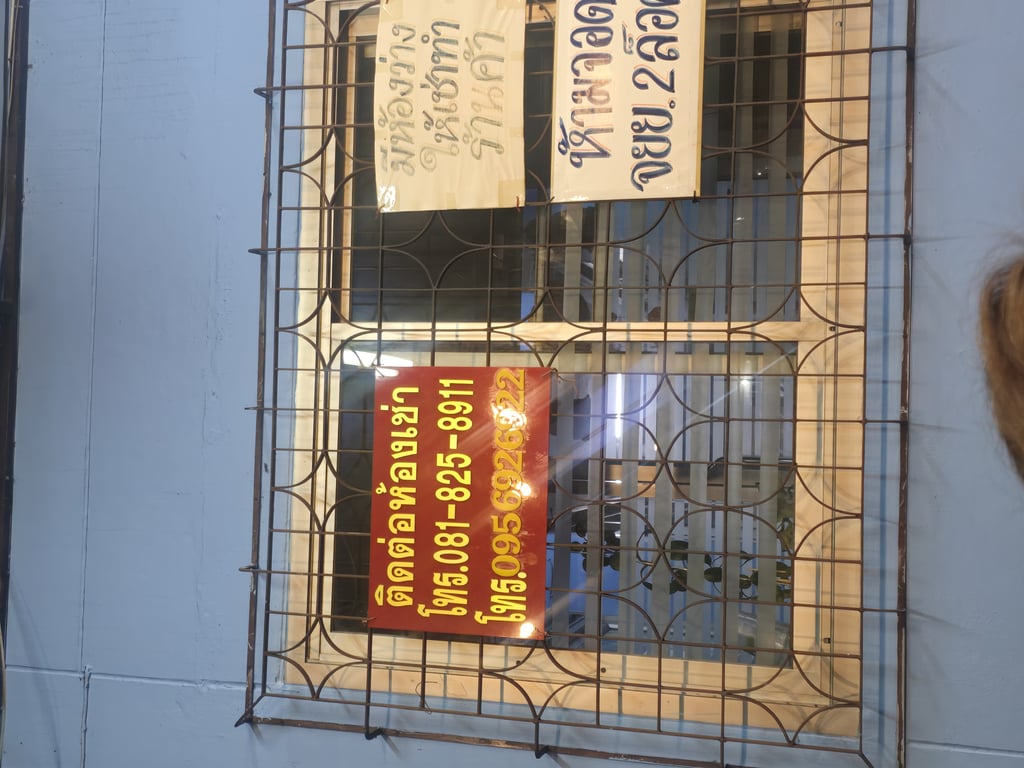 น้องหมาอยูตรงถนน หน้าห้องเช่า หอพักแสนสุข ตึกสีฟ้า หน้าตึกมีร้านส้มตำคอนกลางคืน