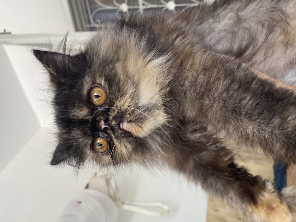 แมวขนยาวสีเปรอะ ตาเหลืองอมส้ม จมูกเล็กแบน สีชมพู-ดำ