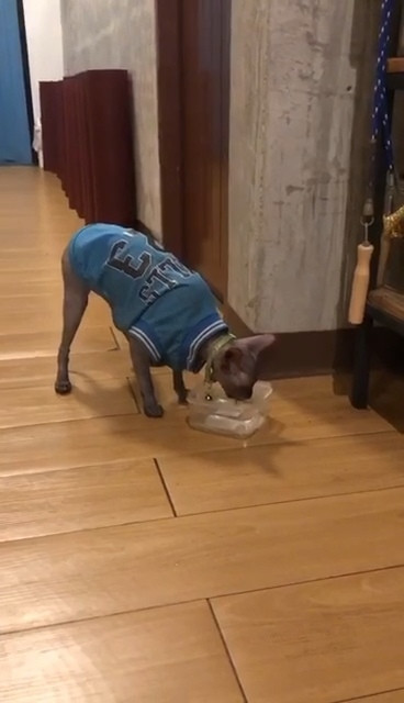 แมวเพศผู้ ทำหมันแล้ว ขี้อ้อนมาก ใส่ปลอกคอสีเขียวสะท้อนแสง กับเสื้อสีน้ำเงินเสื้อบอลลายเบอร์ 23 เข้ามาทางระเบียงสตูดิโอโยคะ สาทรซอย 8