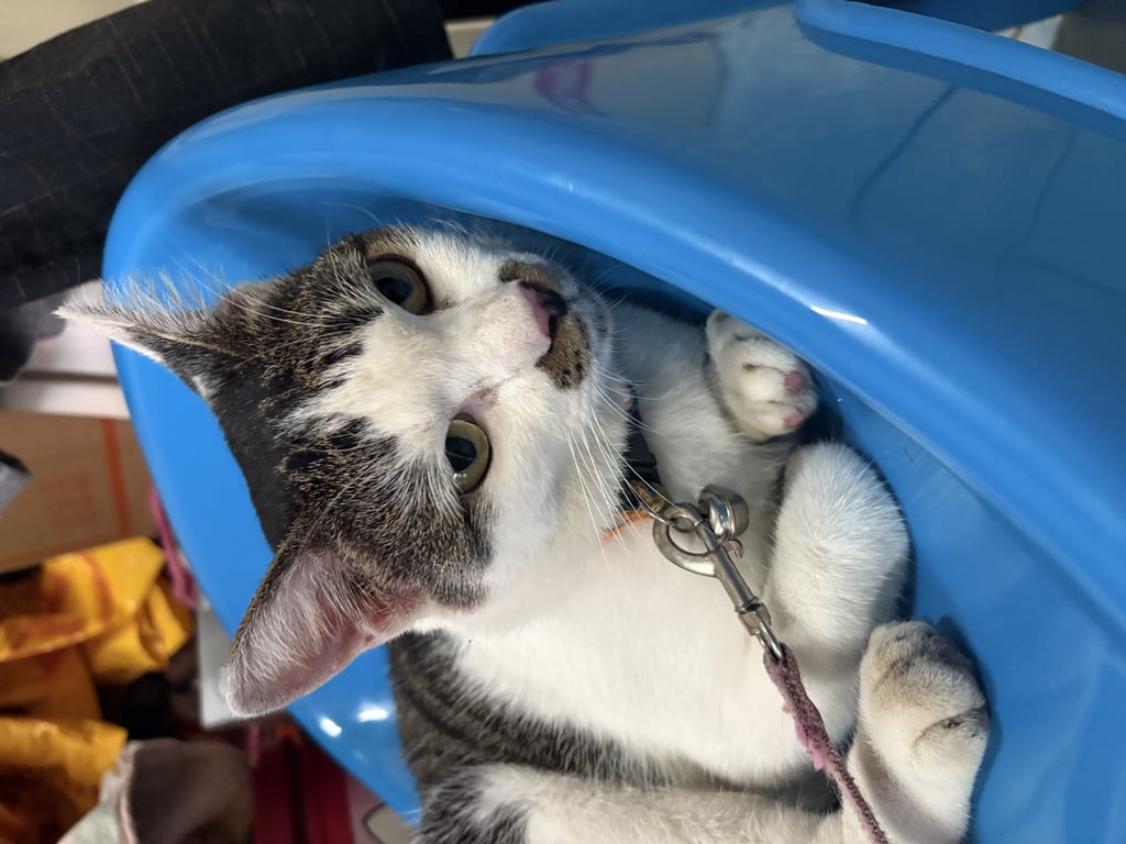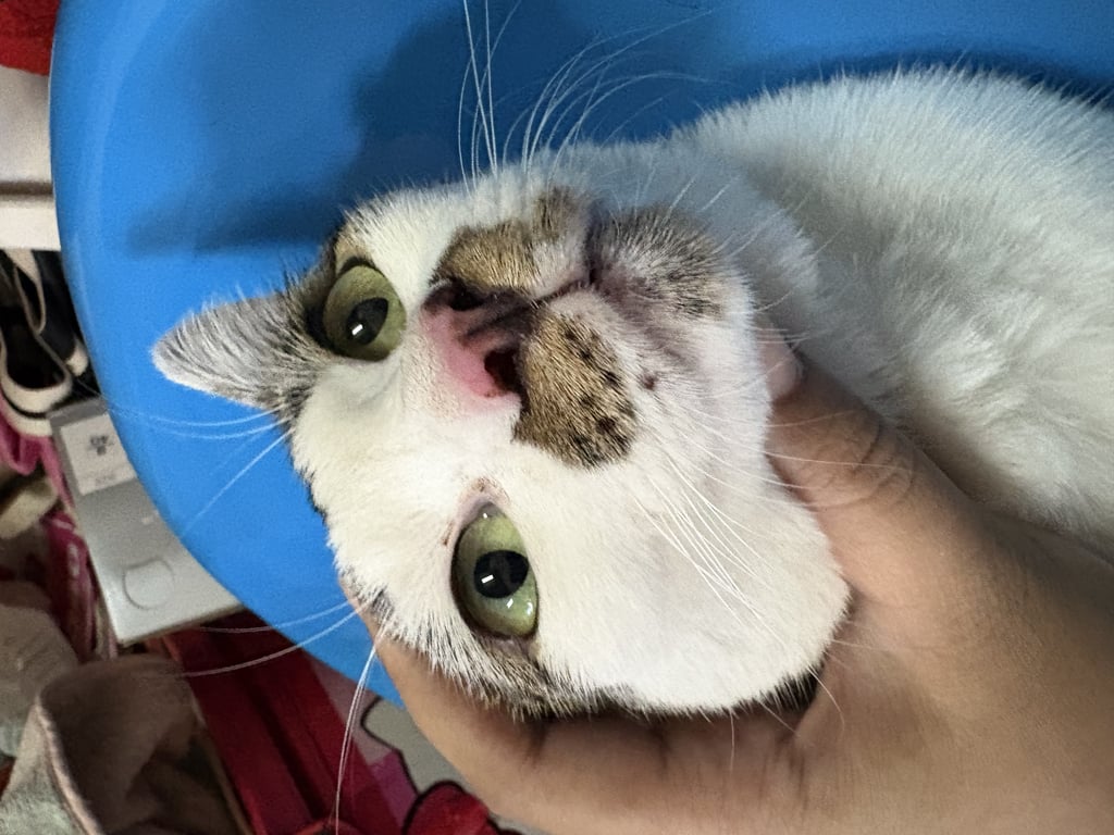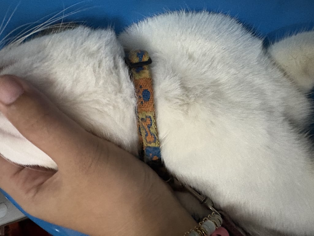 เพศเมีย หางยาว ขนสะอาด มีปลอกคอและกระดิ่ง น้องไม่กลัวคน ขี้อ้อน ลักษณะตรงหน้า ใต้จมูกมีลายสลิดคล้ายหนวด