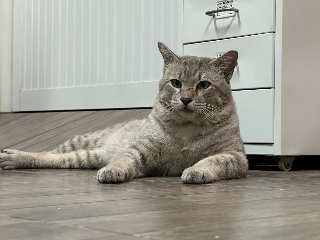 แมว เพศผู้ โตเต็มวัย สีเทาอมน้ำตาล ตัวใหญ่ น่าจะมีสายพันธุ์ มีรอยแผลเป็นที่จมูก เชื่องมาก ติดคน