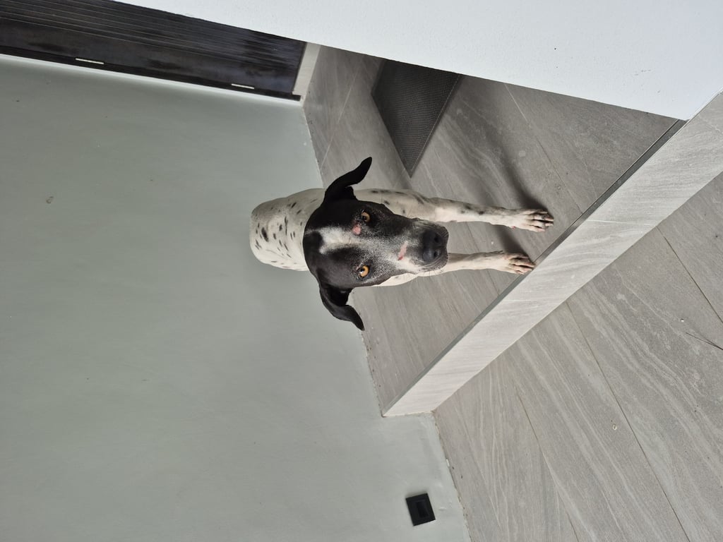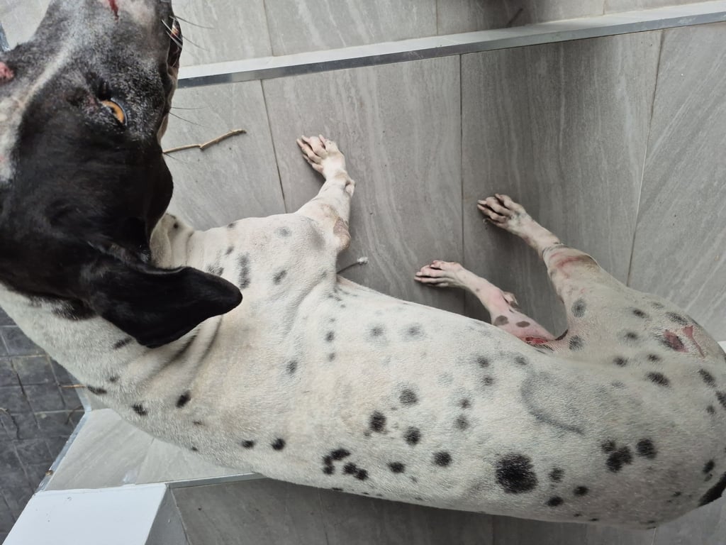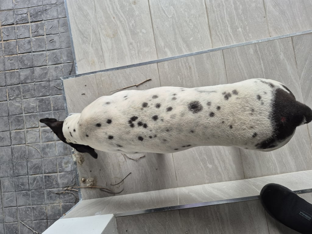 เป็นสุนัขเพศเมีย โตแล้ว ขนสั้น ตัวสีขาสวลายจุดเล็กๆสีดำ หน้าและหางมีดำ ที่ขาหลังซ้ายมีแผล ลำตัวมีแผลเล็กน้อยไม่แน่ใจว่าเกิดจากอะไร