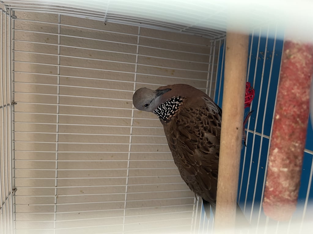 นกเขาตัวใหญ่คอมีลายจุด บินมาติดในห้องครัวที่บ้าน