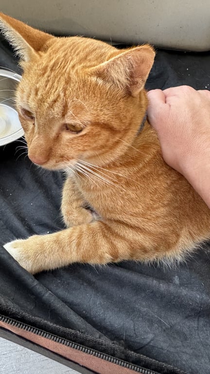 แมวส้ม ตัวผู้ ยังไม่ทำมั่น อายุไม่สูงมาก ชอบคน กลัวรถ ตาสีเหลือง หางสีส้ม ปลายเท้าสีขาว อกมีขาวนิดๆ แต่ส่วนมากเป็นส้ม