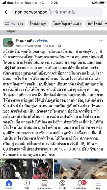 ตลาดวัดมะขาม ศาลเซียนแปะโรงสี จ.ปทุม จะมีผู้ชายเหมือนเมาๆ มานั่งเอาหมาผูกไว้ ใช้หมาขอเงิน ไม่มีน้ำ มีแต่ข้าวแข็งๆ ดำๆ ใส่ถุงวางข้างๆ หมาแววตาเศร้า มองแต่คนรอบข้าง ไม่มองผู้ชายคนนั้น ไม่เหมือนหมากับเจ้าของทั่วๆไป เหมืินขโมยมาค่ะ พอดีไปเจอเหตุการมีคนพาน้องหมาสายพันธุ์ชิวาว่าสีน้ำตาลขาวมานั่งขอเงินอยู่ตรงตลาดวัดมะขาม อยู่แถวจ.ปทุมธานี โดนล่ามด้วยโซ่ที่ขึ้นสนิมตรงบริเวณคอ ตรงจมูกน้องมีแผลถลอกไม่รู้ว่าเกิดจากอะไร. จากการได้สอบถามแม่ค้าเบื้องต้นบอกว่าเป็นหมาของผูชายคนนั้นซึ่งบางครั้งมีอาการมึนเมา แต่ไม่แน่ใจว่ามึนเมาอะไร ซึ่งการได้มาของน้องหมาไม่แน่ใจว่าได้มายังไง เค้าจะพาน้องมานั่งขอเงินแบบนี้บ่อยๆ เกือบทุกวัน เค้าเป็นคนแถวนั้น และไม่มีน้ำวางไว้ให้น้องกิน ข้าวเป็นข้าวที่แห้งๆ แข็งๆ ดำๆ อยู่ในถุงพลาสติกวางตรงพื้น คือน้องไม่ควรมาอยู่แบบนั้น. เลยอยากให้ทางเพจ หรือมูลนิธิได้เข้าไปดูหรือสอบถามหาข้อมูลเพิ่มเติมว่าน้องเป็นยังไง กินอยู่แบบไหน สภาพเป็นอยู่เป็นยังไงบ้าง ใช่หมาของเค้าจริงไหม เห็นแล้วสงสารน้องมากๆ น้องไม่ควรที่จะมานั่งอะไรแบบนี้ เบื้องต้นได้นำอาหารเม็ด สเปรย์ยา ถ้วยใส่น้ำ เบาะรองนั่ง เสื้อ สายจูงไปให้น้อง แต่ไม่รู้ว่าเค้าจะใช้ของที่นำไปให้กับน้องไหม ไม่กล้าสอบถามอะไรเค้ามาก. เลยอยากให้ทางเพจ หรือมูลนิธิช่วยประสานงาน หรือว่าตามเรื่องดูครับ ว่าเรื่องราว ที่มาที่ไปเป็นยังไง เป็นหมาเค้าจริงไหม. ได้น้องมายังไง สภาพความเป็นอยู่ ดูแลน้องดีไหมครับ เจอเมื่อประมาณวันที่ 18, 19 พ.ย. 68 ช่วงเวลาที่ไปเจอประมาณ 11.00 น. - 13.00 น. ยังไงก็รบกวนด้วยนะครับ. ขอบคุณล่วงหน้าครับ