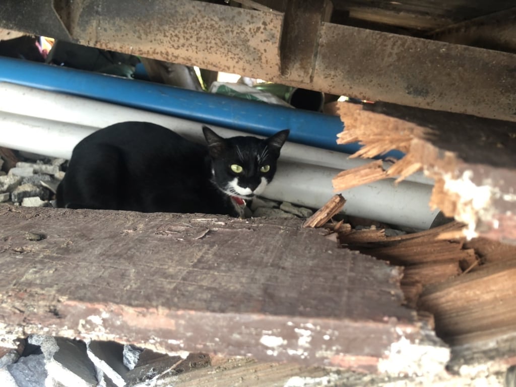 แมวตัวโตสีดำจมูกคอสีขาว ตาสีเหลือง ใส่ปลอกคอสีแดงมีกระดิ่งสีส้ม
