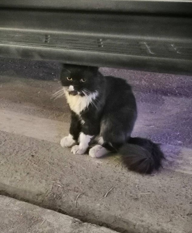 เปอร์เซียสีดำ ตรงหนวด หน้าอก และสี่เท้าสีขาว เดินขาหลังกะเผลก ขาหน้ามีรอยเลือด