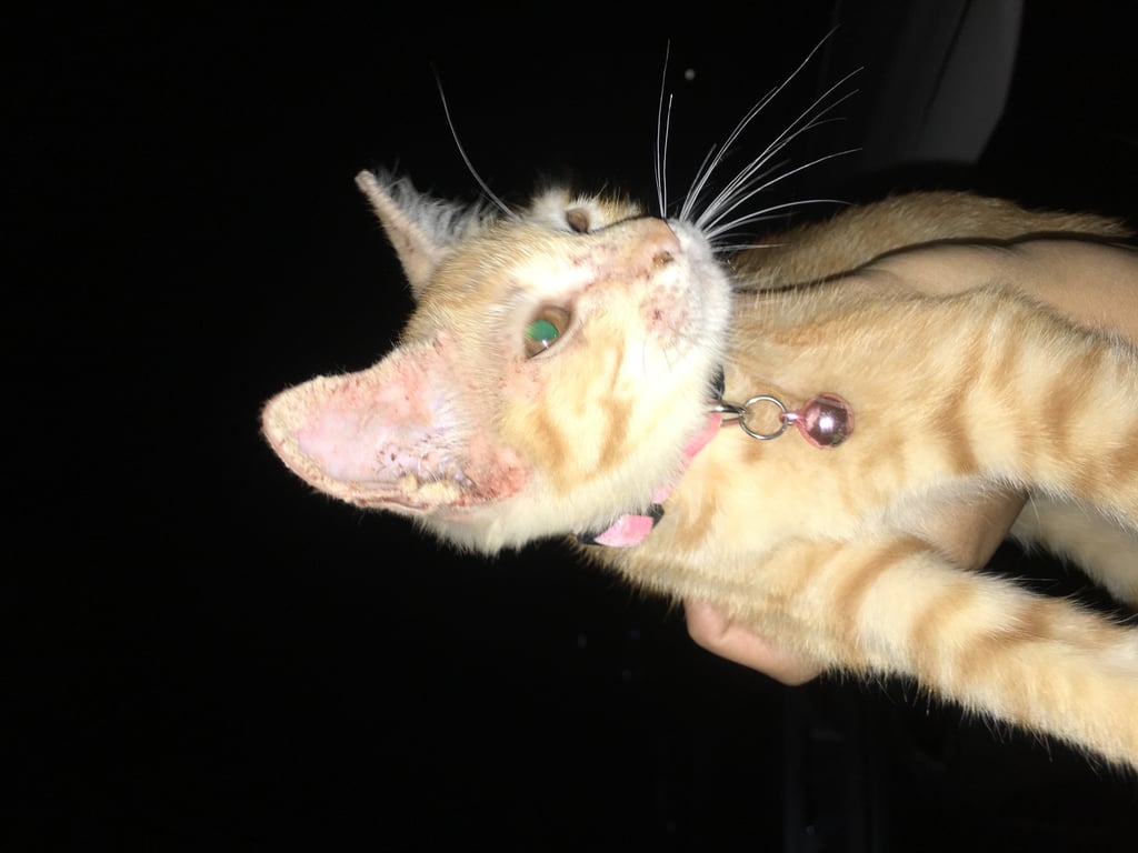 เจอที่แคลิฟอเนียร์ ตรงข้ามชาบูกินรึยัง น้องน่าจะเป็นขี้เรื้อนบริเวณหูและหน้า อายุ 2-3เดือน ดูคุ้นมือและอ้อนนะ เหมือนพึ่งหลงมา ไม่น่าจะมีคนมาทิ้งทั้งปลอกคอ