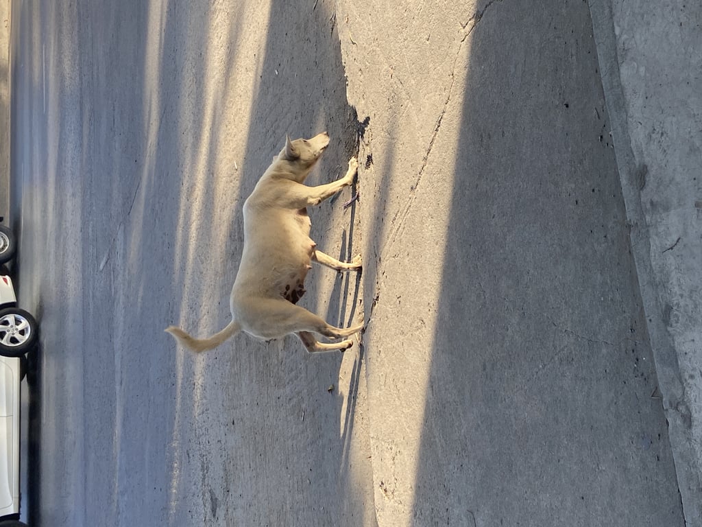 อยู่ตรงป้ายรถเมสะพานชมพู สะพานคอนโดลุมพินีรังสิต น้องกำลังเดินหากินแถววิน ไม่แน่ใจว่าน้องท้องหรือไม่