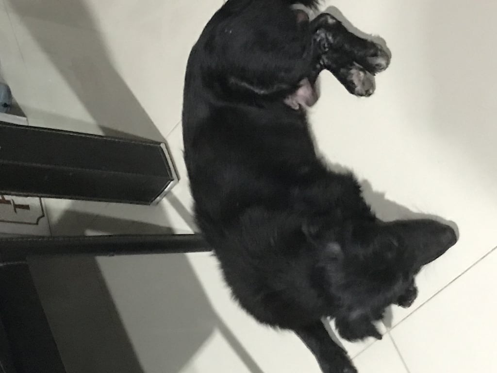 ตัวเตี้ย สีดำ เท้ามีสีขาว 3 ข้าง อกมีสีขาวนิดหน่อย ตัวไม่ใหญ่มาก หนักประมาณ 10 กิโล