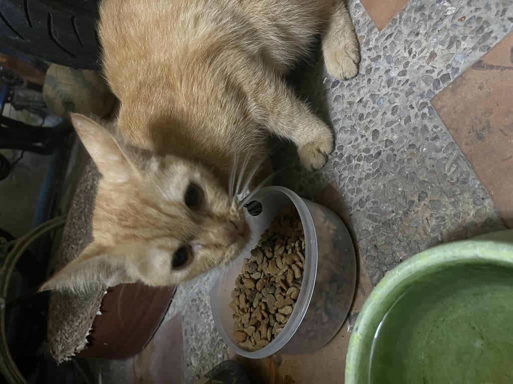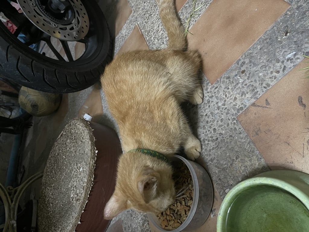 น้องแมวสีส้มเพศผู้ ใส่ปอกคอสีเขียว น้องเชื่องมาก ไม่กลัวคนเลย
